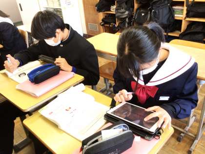 23学級は、国語の「同じ訓・同じ音を持つ漢字」の授業の様子です。同じ読みをする熟語の使い分けについて、練習問題を解きながら理解を深めていました。不安がある問題は、学習用タブレットを使って調べていました。