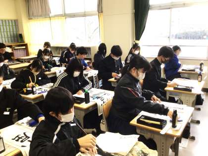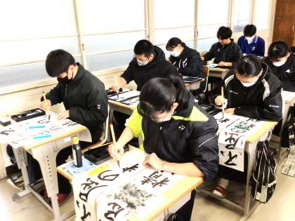 2,3限に書き初め大会が行われました。1年生は「万里一空」2年生は「笑門来福」3年生は「不屈の精神」を書きました。どの教室も張りつめた空気の中、真剣に取り組んでいました。生徒たちの表情から、今年一年にかける意気込みが伝わってきました。