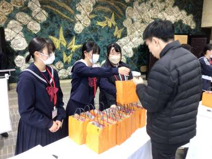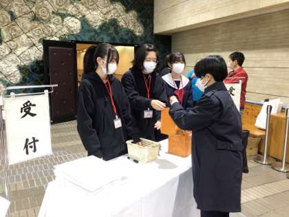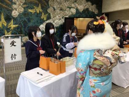 ボランティアの生徒たちは、受付で記念品を手渡す役割を行った後、式典に参加して集いの雰囲気を味わいました。その後、二十歳の参加者が中学校時代に書いた「二十歳の自分への手紙」を、参加者が受け取りやすいように並べる役割を行いました。