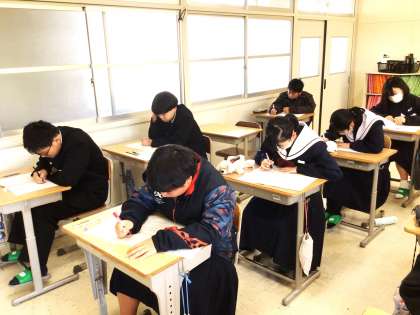 14学級は、数学の授業の様子です。今月末に行われる学習診断テストに向けて、対策プリントを集中して解いていました。