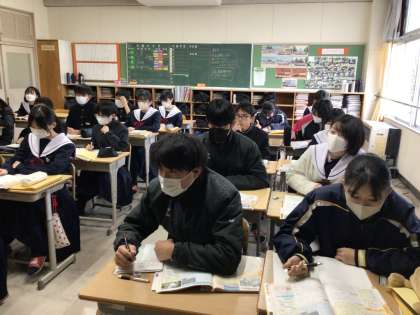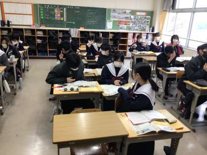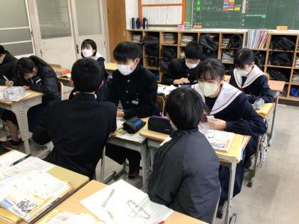 33学級は、社会の「持続可能な社会」の授業の様子です。始めに日本の公害対策について学び、そこから現在目指している循環型社会について、友達同士で確認しながらその実現に向けて考えました。