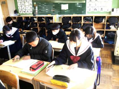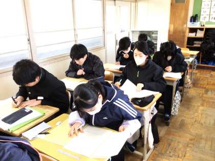 23学級は、理科の授業の様子です。1月末に行われる学習診断テストに向けて、対策プリントを集中して解いていました。