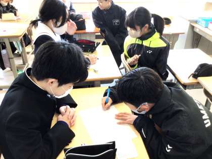 11学級は、数学の授業の様子です。学習診断テストに向けて、平面図形について復習していました。疑問点があると、級友と話し合いながら理解を深めていました。全体の話し合いでは、自分の考えを黒板に図などを書きながら堂々と説明していました。