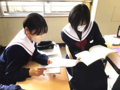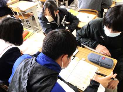 33学級は、数学の「三平方の定理の利用」の授業の様子です。章末問題を解いていました。疑問点があると、級友と話し合いながら、解き方、考え方を確認していました。