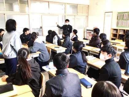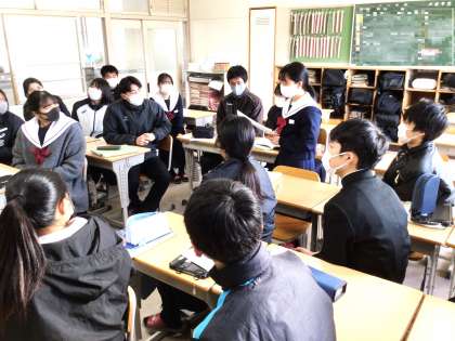 32学級は、英語の授業の様子です。「夏と冬、どちらの季節が好きか」のテーマでALTとともに英語で討論を行っていました。ジェスチャーを入れながら発表するなど、討論はとても盛り上がっていました。