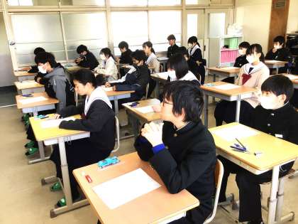 問題用紙(解答用紙)が配付され、テスト開始を待つ12学級の様子です。