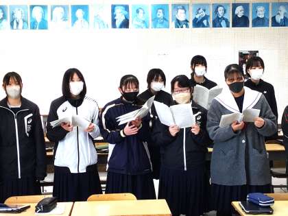 2/19(水) 授業の様子です(3年生) 2 公開日 2025/02/19 更新日 2025/02/19 お知らせ 32学級は、音楽の授業の様子です。卒業式で歌う「群青」の練習を行っていました。気持ちのこもった歌声が音楽室に響き渡っていました。