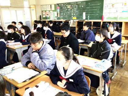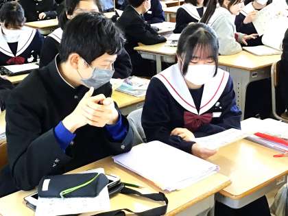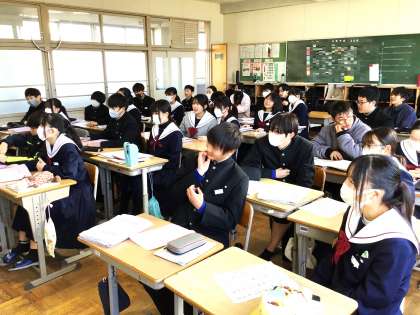 21学級は、英語の「Unit7 Read and Think2」の授業の様子です。授業の最初に、不規則動詞について、級友と問題を出し合いながら確認していました。その後、教科担任が動詞の原形を言うと、過去形・過去分詞について自信を持って答えていました。