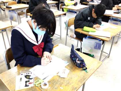 11学級は、美術の「スクラッチアクセサリー制作」の授業の様子です。完成に向けて集中して取り組んでいました。表面が終わった人は、裏面の作成を行っていました。