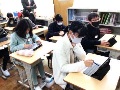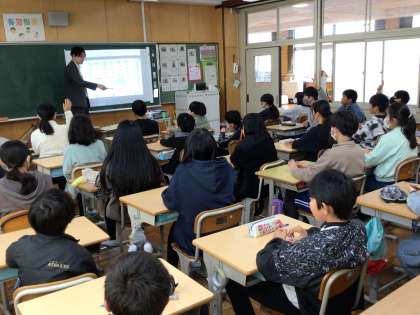 6年3組が中学校教員の社会の授業を受けている様子です。