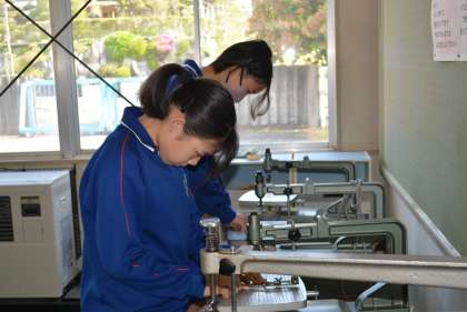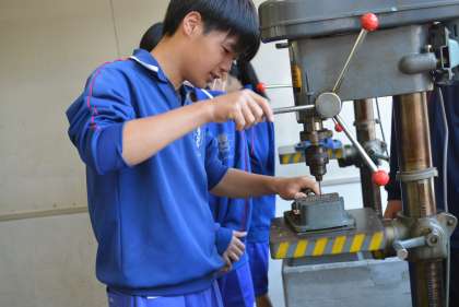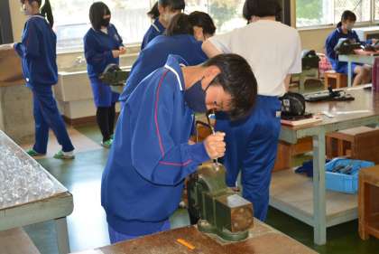 23学級は、技術の「キーホルダー作り」の授業の様子です。金属板を糸のこで切断したり、やすりで削ったりして、自分の思い通りの形に加工していました。