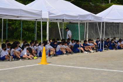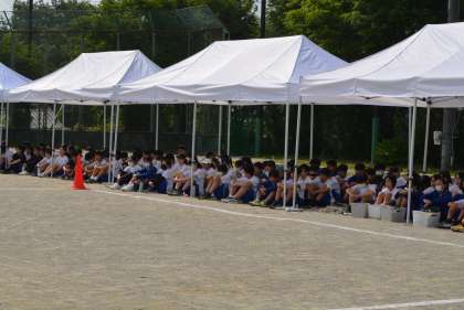 体育祭の全校練習を1・2時間目に行いました。今年度も例年のように全校生徒分のテントを設置し、テントの中で説明を聞くなど、熱中症防止対策を講じています。