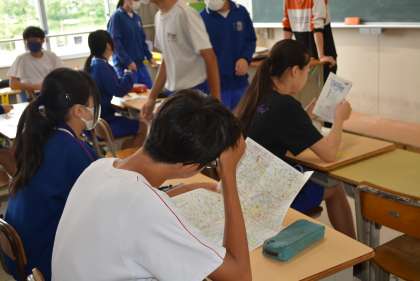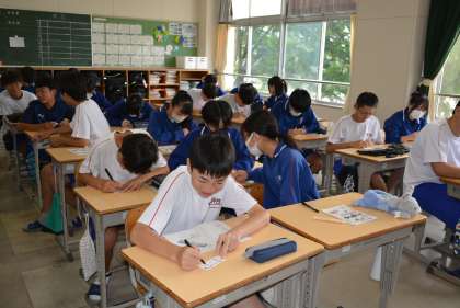 3年生は明日から修学旅行ということで、今日の1時間目はそれに向けた学級活動を行いました。学級ごとに、荷物に付けるタグを配布して記名したり、地図を配布したり、食事の時の座席を決めたりするなど、さまざまな準備を行いました。