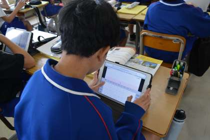 各自でテーマを決め、タブレットで資料を集めながら紹介する英文を作成していました。