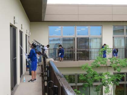 先週の土曜日にボランティア部が地域の養護老人ホーム若草苑で施設の清掃を行いました。梅坪台地区の民生委員さんと共に、ホームの窓拭きや床の掃き掃除に意欲的に取り組みました。今後も、地域の方々との交流を通して、地域や社会のために自分たちにできることについて考え取り組んでいきたいと思います。