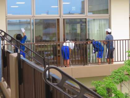 ボランティア部が地域の養護老人ホーム若草苑で施設の清掃を行っている様子です。