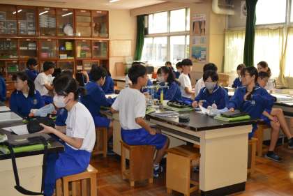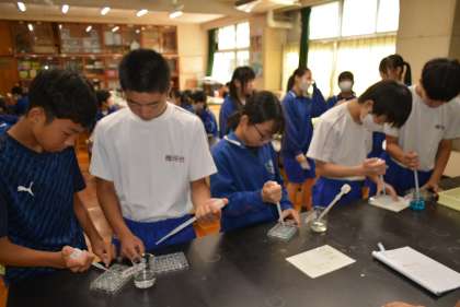 31学級は、理科の「イオンへのなりやすさ」の授業の様子です。水溶液に金属片を入れたときの変化を調べて、結果からわかることを考えていました。