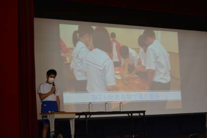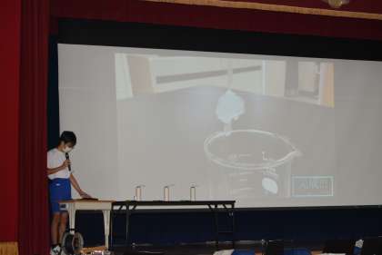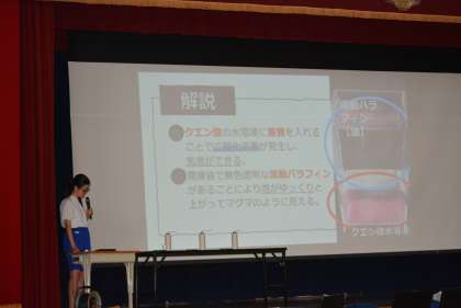 まず、昨年度に参加した「T-tic」「ものづくりフェスタ」「サイエンスカーニバル」について発表しました。その後、「海底マグマ実験」「ミョウバンの結晶づくり」の2つに実験について説明し、最後には先生方にも参加してもらいながら、シャボン玉に入っている気体を当てるクイズを実演を交えながらステージの上で行いました。