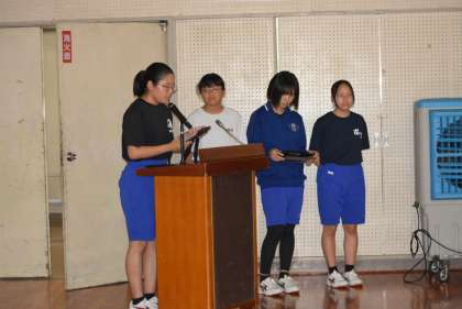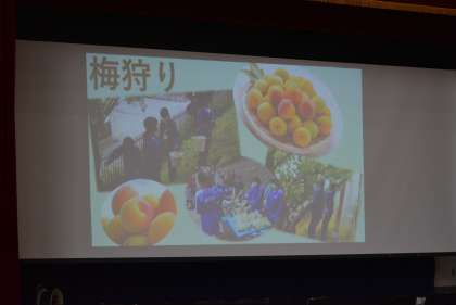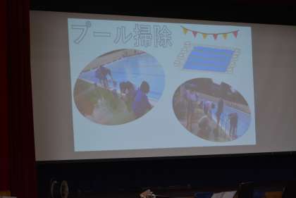 校内の清掃活動、体育祭で使用したペグづくり、若草苑での奉仕活動、梅の実収穫、プール清掃、蔵書点検など、みんなのためになることをいろいろ行ってきました。その内容を、「春の活動」「夏の活動」というように季節ごとに分け、写真を見せながら紹介しました。