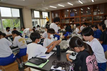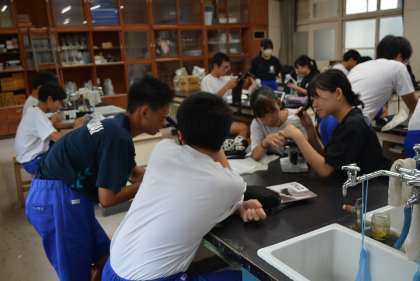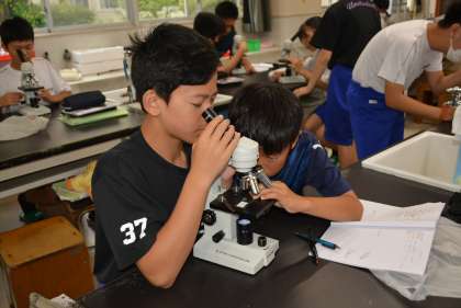 顕微鏡を使って微小生物の観察を行っていました。ピントを合わせるのが難しいのですが、中にはすぐに合わせてスケッチを始める生徒もいました。