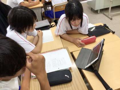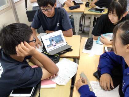 3年3組で国語の研究授業を行いました。高校の魅力を紹介するという活動の中で、より説得力のある表現方法を見つけ出していくために、お互いの発表の様子を見合い修正点を出し合いました。発表の動画を一時停止しながら、活発に意見交換を行い、数値や比較を具体的に示し聞き手にイメージを持ちやすくする工夫を考え出していました。