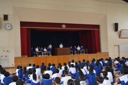 本日の5時間目に後期生徒会立会演説会・選挙を行いました。体育館に全校生徒が集まり、選挙管理委員の司会で立候補した生徒の演説を聞きました。立候補した生徒は、全校生徒に「梅坪台中学校をさらによくしていきたいという気持ち」を込めた公約を堂々と発表していました。立候補した生徒の演説を聞きながら、後期の梅坪台中学校の生徒会活動が楽しみになりました。