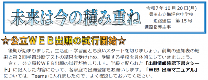 さて、公立高校WEB出願の試行が始まります。学級で配られた「出願情報確認下書きシート」に記入した内容に沿って、各家庭で出願登録をお願いします。「WEB出願マニュアル」については、Teamsに入れましたので、よく確認しておいてください。