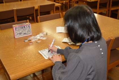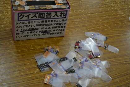 ハロウィンクイズの採点では、図書館祭り(ハロウィン祭り)で実施しているクイズの解答用紙を採点し、満点の生徒にプレゼントするしおりの準備をしてくださいました。この祭りは来週の金曜日(31日)まで続きます。ぜひ、参加してくださいね。