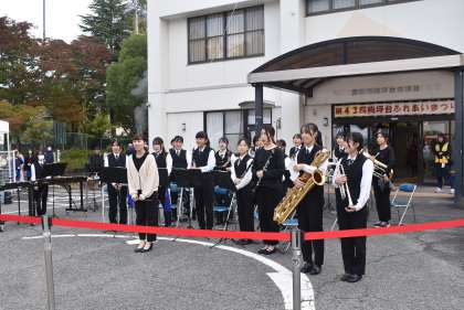 本日、吹奏楽部が梅坪台交流館ふれあい祭りのオープニングで演奏を披露しました。演奏した曲は「ファンファーレ集」「名探偵コナン メインテーマ」の2曲です。演奏後は、会場から大きな拍手が起こるなど、地域の方の温かみを感じました。
