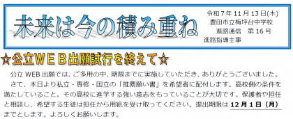 公立WEB出願では、ご多用の中、期限までに実施していただき、ありがとうございました。さて、本日より私立・専修・国立の「推薦願い書」を希望者に配付します。高校側の条件を満たしていること。その高校に進学する強い意志をもっていることが大切です。保護者や担任と相談し、希望する生徒は担任から用紙を受け取ってください。提出期限は12月1日(月)までとします。よろしくお願いします。