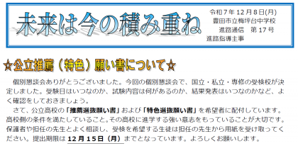 さて、公立高校の「推薦選抜願い書」および「特色選抜願い書」を希望者に配付しています。高校側の条件を満たしていること。その高校に進学する強い意志をもっていることが大切です。保護者や担任の先生とよく相談し、受検を希望する生徒は担任の先生から用紙を受け取ってください。提出期限は12月15日(月)までとなっています。よろしくお願いします。