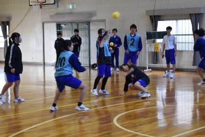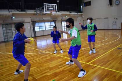 ハンドボールを使ったバスケットボールのような競技をしています。