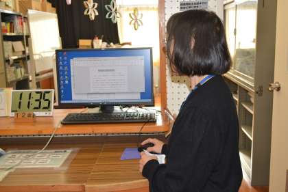 毎週金曜日には図書館司書が来校して、図書館の整備など様々な活動をしています。今日は、授業で使用する本の借り入れ準備と来週の委員会の準備、昼の放送などを行っていただきました。