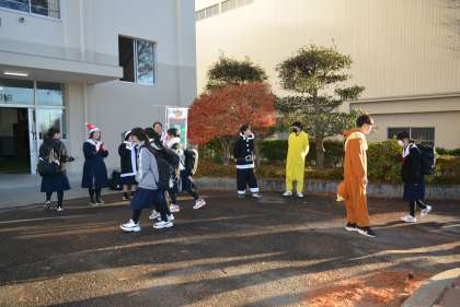 今朝、3年生の議員と生徒会担当の先生たちが登校時に昇降口に立ってあいさつ運動を行いました。クリスマスが近いということで、サンタクロースの衣装を身に付けたり、クリスマスソングを流すなどして楽しい雰囲気を出しながらのあいさつ運動でした。