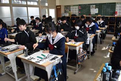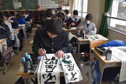 2,3限には、毎年恒例の書き初め大会が行われました。1年生は「万里一空」2年生は「大器晩成」3年生は「不屈の精神」を書きました。どの教室も真剣に取り組んでいました。生徒たちの表情から、今年一年にかける意気込みが伝わってきました。