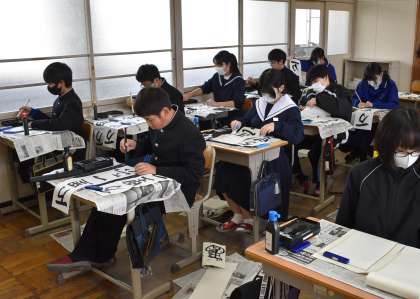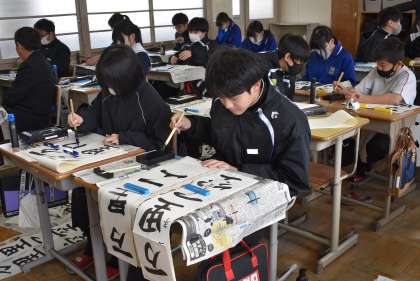 2,3限には、毎年恒例の書き初め大会が行われました。1年生は「万里一空」2年生は「大器晩成」3年生は「不屈の精神」を書きました。どの教室も真剣に取り組んでいました。生徒たちの表情から、今年一年にかける意気込みが伝わってきました。