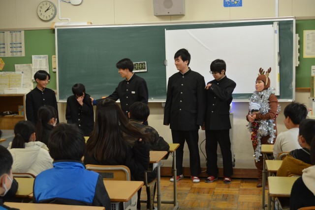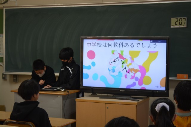 中学校の学習・部活動紹介では、1年生は、6年生にパワーポイントで映像を流しながら堂々と発表を行い、6年生も集中して聞いていました。また、生活紹介では、「お楽しみ劇場」としてお笑い劇場風の発表を行い、見ている6年生も笑顔であふれていました。
