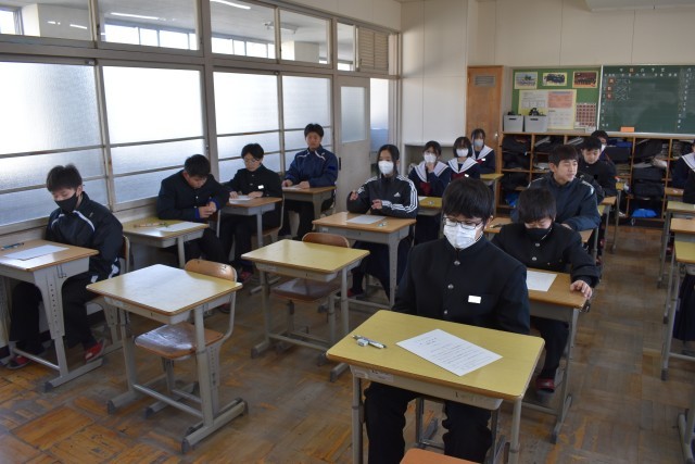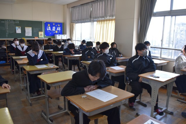 問題用紙(解答用紙)が配付され、テスト開始を待つ13学級の様子です。
