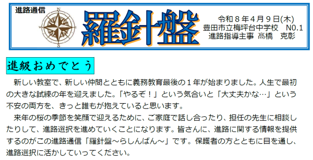 来年の桜の季節を笑顔で迎えるために、ご家庭で話し合ったり、担任の先生に相談したりして、進路選択を進めていくことになります。皆さんに、進路に関する情報を提供するのがこの進路通信「羅針盤~らしんばん~」です。保護者の方とともに目を通し、進路選択に活かしていってください。