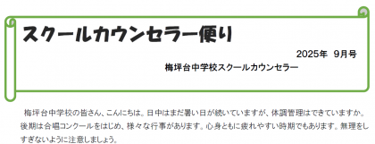 梅坪台中学校の皆さん、こんにちは。日中はまだ暑い日が続いていますが、体調管理はできていますか。後期は合唱コンクールをはじめ、様々な行事があります。心身ともに疲れやすい時期でもあります。無理をしすぎないように注意しましょう。