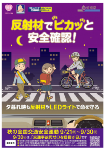 本日より、9月30日(火)まで秋の全国交通安全運動が行われます。秋は、日の入り時刻が急激に早まり、運転者から歩行者や自転車の動きが見えづらくなる夕暮れ時と、仕事や学校からの帰宅時間帯とが重なるため、歩行者や自転車利用者が被害に遭う交通事故の危険性が高まります。
