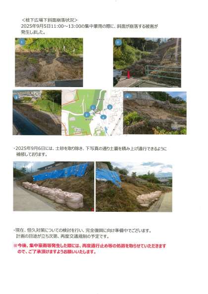 梅坪町自治区の区長さんから連絡をいただきました。先週の金曜日の大雨の影響で、枝下広場下の斜面が崩落したとのことです。現在は応急的に復旧してありますが、再び大雨に見舞われることがあれば、通行止めにすることもあるので、天候も見ながら気を付けて通行してほしい、とのことでした。