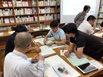 授業での対話活動を充実させていくために、ファシリテーショントレーニングを実施しました。対話を進行したり、ゆさぶったりするためのリフレーミングについて学び、先生を生徒に見立てて体験的な研修を行いました。