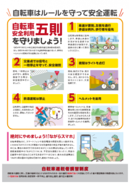 自転車安全利用五則を再認識し、ヘルメット着用などルールを遵守しましょう。