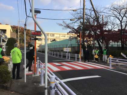 年末の交通安全運動期間です。地域の方々の働きかけにより、梅坪小学校と梅坪こども園の間にある遊歩道と市道が交わる地点に、「ぴかっとわたるくん」が設置されました。横断歩道を渡るときに、設置されたボタンを押すと、黄色灯が点滅するとともに「横断者注意」「とまってくれてありがとう」などの文字が表示され、自動車の運転手に注意を促すというものです。この場所は中学校の通学路上ではないので、登下校で通る生徒はほとんどいないと思いますが、通る機会があるときには活用し、安全に通行してください。よろしくお願いします。