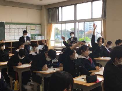 本日、豊田市教育委員会の方が来校し、授業の様子を見られました。授業を見られた教育委員会の方から「落ち着いた態度で授業を受けていますね」「生徒の主体性を大切にして、生徒が対話することによって理解を深めている姿がたくさん見られました」という話がありました。