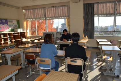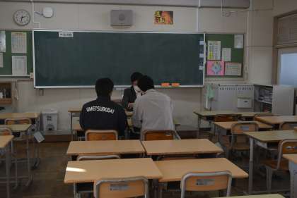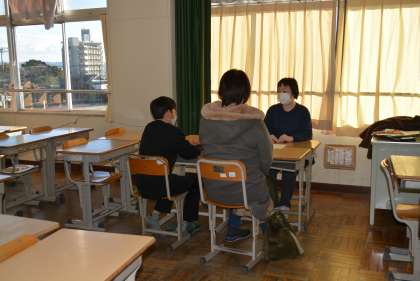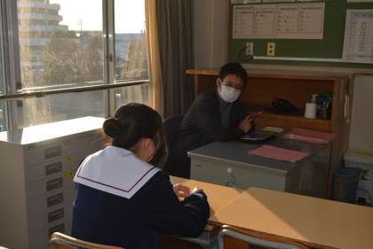 今週の火曜日からテスト・教育相談週間となり、授業後の時間などを活用して、教育相談を行っています。事前に答えたアンケートをもとに、担任の先生と一対一で話をしています。