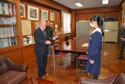 夏休みの自由課題として生徒が取り組んだ「社会を明るくする運動作文コンクール」において、本校3年生の生徒が豊田市で最優秀賞に輝きました。本日、コンクールを主催する保護司会の会長様を始め3名の方が来校され、校長室にて表彰をしていただきました。おめでとうございます!