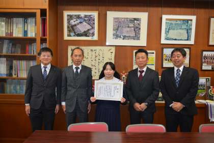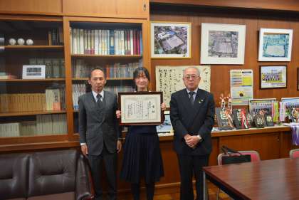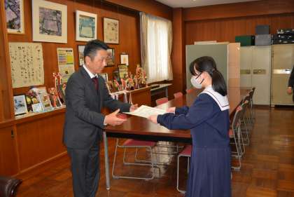 夏休みの自由課題として生徒が取り組んだ「税に関する作文コンクール」において、本校3年生の生徒が優秀賞に輝きました。本日、コンクールを主催する豊田税務署管内納税貯蓄組合連合会の会長様を始め4名の方が来校され、校長室にて表彰をしていただきました。おめでとうございます!