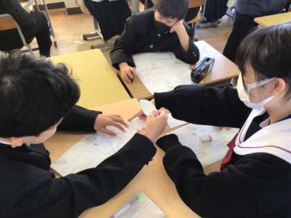 1年3組で数学の研究授業を行いました。生徒は自分なりの解き方を具体物を操作しながら一生懸命に説明していました。相手に分かりやすく伝わるように、図形の成り立ちと式とをどう使うか工夫していました。